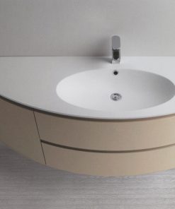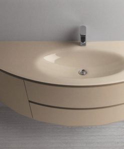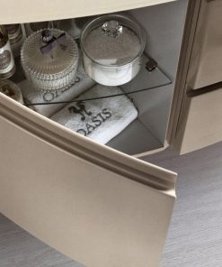 Подвесная база под раковину с двумя выдвижными ящиками и распашной дверцей. Каркас ящиков изготовлен из металла. Боковой отдел оснащён внутренней стеклянной полкой. Возможны другие варианты отделки. Столешница с раковиной заказываются дополнительно