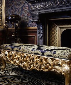 Банкетка. Декорирована резными элементами ручной работы. Наполнение — полиуретан. Возможны различные варианты обивки и отделки.