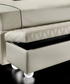 Банкетка в мягкой обивке с внутренним контейнером и четырьмя круглыми ножками. Сиденье декорировано стёганой прошивкой. Ножки выполнены вручную из муранского стекла. Возможны другие варианты отделки и обивки. Подсветка для ножек заказывается дополнительно