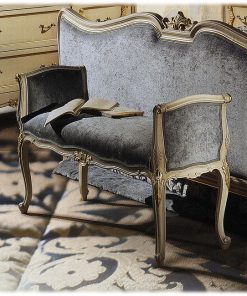 Банкетка с подлокотниками. Наполнение — полиуретан. Декорирована резьбой. Ручная работа. Возможны различные варианты отделки (красное дерево, махагон, охра, декапе и т.д.) и обивки.