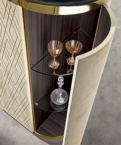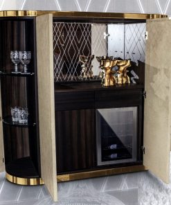 Барный шкаф в кожаной обивке с декором и четырьмя распашными дверцами. Оснащён стеклянными полками и двумя выдвижными ящиками. Рама и основание выполнены из металла. Возможен вариант бара обивке из кашемира или кожи без декора. Возможны другие варианты отделки и обивки. Дополнительно можно заказать зеркало с лазерной гравировкой и подсветкой, и холодильник для хранения напитков