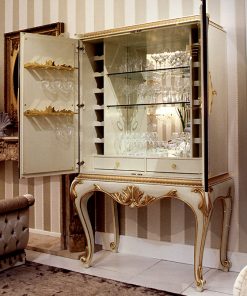 Бар с двумя распашными дверцами. Внутреннее оснащение: 2 выдвижных ящика, 2 стеклянные полки, зеркальная задняя стенка. Украшен резьбой. Возможны другие варианты отделки.