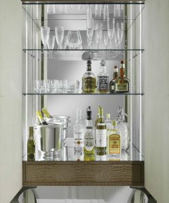 Барный шкаф в кожаной обивке с двумя распашными дверцами и фигурными металлическими ножками. Онащён подсветкой, двумя стеклянными полками и выдвижным ящиком. Возможны другие варианты отделки и обивки. По запросу возможно выполнение в нестандартных размерах