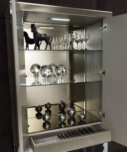 Барный шкаф в зеркальной отделке с двумя распашными дверцами и фигурными металлическими ножками. Дверцы обиты кожей и декорированы стёганой прошивкой. Онащён подсветкой, зеркалом, двумя стеклянными полками и выдвижным ящиком. Возможен вариант бара в отделке из дерева. Возможны другие варианты отделки и обивки. По запросу возможно выполнение в нестандартных размерах