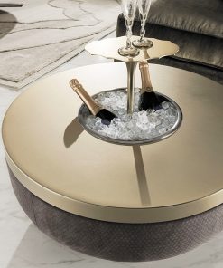 Барный столик с круглой металлической столешницей и основанием. Конструкция выполнена из стеклопластика, обтянутого кожей или тканью. Оборудован подносом с фигурной столешницей и нишей для съёмного ведёрка из нержавеющей стали для бутылок и бокалов. Возможны другие варианты отделки и обивки