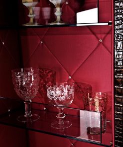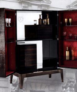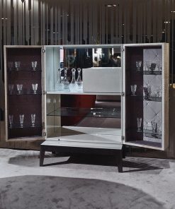 Барный шкаф с двумя распашными дверцами в обивке из кожи или кашемира. Ручки выполнены из мрамора. Оснащён стеклянными полками и зеркальной задней панелью со светодиодной подсветкой. Изнутри дверцы обиты атласом в технике капитоне и декорированы кристаллами Swarovski. Основание выполнено из металла. Возможны другие варианты отделки и обивки. Дополнительно можно установить холодильник для хранения напитков
