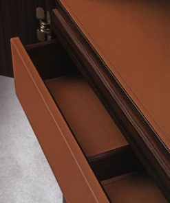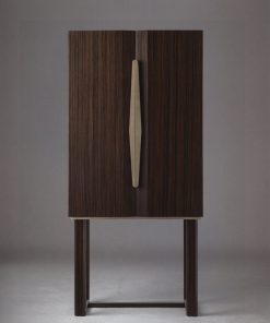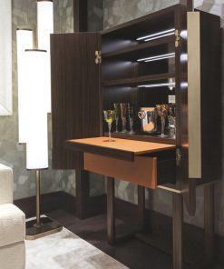 Барный шкаф с двумя распашными дверцами. Оснащён подсветкой, выдвижным столиком и ящиком в кожаной отделке. Задняя панель декорирована бронзированным зеркалом. Возможны другие варианты отделки. Кожаные коврики для полок заказываются дополнительно