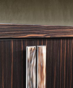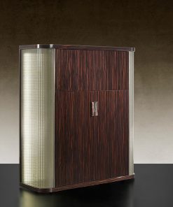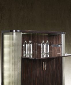 Барный шкаф с двумя распашными и одной откидной дверцами. Оснащён стеклянными полками и внутренней подсветкой. Откидная дверца с системой открывания push-pull. Закруглённые боковины выполнены из рифлёного стекла и декорированы металлическими вставками. Возможны другие варианты отделки. Дополнительно для боковин можно заказать светодиодную подсветку