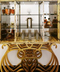 2-х дверный бар с фигурным основанием. Полки выполнены из стекла. Внутри бар декорирован зеркалом.