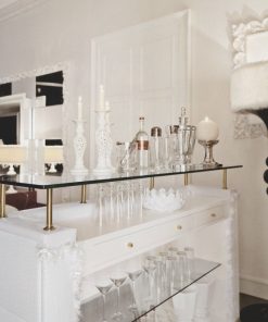 Бар с барной стойкой. Барный шкаф с открытыми стеклянными полками, декорирован резьбой. Стойка в мягкой обивке с тремя выдвижными ящиками, стеклянной столешницей и полкой. Возможны другие варианты отделки и обивки