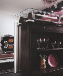 Бар с барной стойкой. Барный шкаф с открытыми стеклянными полками, декорирован резьбой. Стойка оснащена выдвижными ящиками, полкой и стеклянной столешницей. Возможны другие варианты отделки
