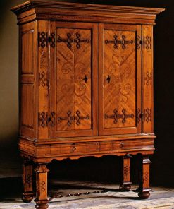 2-х дверный бар с 2-мя ящиками и 2-мя выдвижными подставками. Внутренняя задняя панель зеркальная. Декорирован инкрустацией ручной работы. Возможны другие варианты отделки.