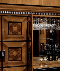 Бар с 4 распашными дверцами. Зеркальная задняя стенка, полки выполнены из стекла. Украшен инкрустацией. Возможны другие варианты отделки.