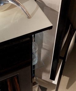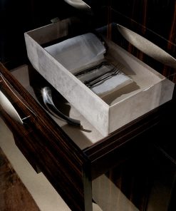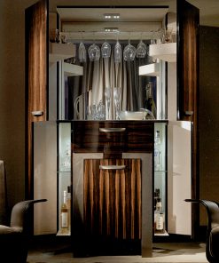 Бар с обитыми ножками, распашными дверцами и выдвижными ящиками. Светодиодная подсветка с датчиком движения. Возможны другие варианты отделки и обивки.