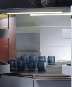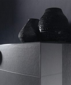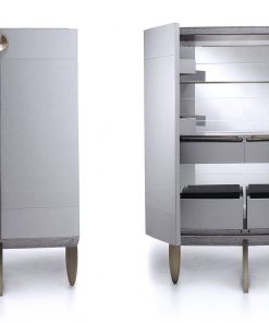 Буфет с двумя распашными дверцами в кожаной обивке. Ножки выполнены из металла. Оснащён выдвижными ящиками, стеклянными полками и подсветкой. Возможны другие варианты отделки
