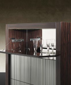 Барный шкаф с двумя распашными и одной откидной дверцами. Оснащён подсветкой. Дверцы выполнены в отделке из стекла с декором. Возможны другие варианты отделки