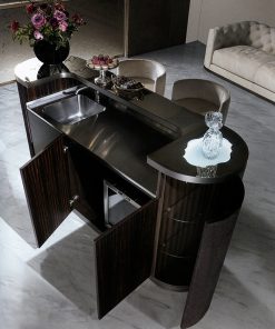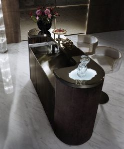 Барная стойка с обитым кожей основанием и металлической столешницей. Оборудована стеклянными полками и светодиодным светильником со стеклом, установленным на столешнице. Две распашные дверцы и внутренняя отделка стойки выполнены из дерева. Боковые дверцы обиты кожей. Возможны другие варианты отделки и обивки. Оборудование (мойка и смеситель) заказывается дополнительно. Так же дополнительно можно заказать холодильник для хранения напитков