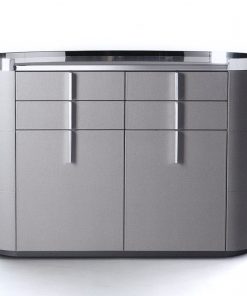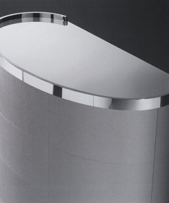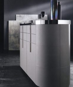 Барная стойка в кожаной обивке с овальной металлической столешницей, распашными дверцами и выдвижными ящиками