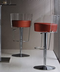 Вращающийся барный стул, регулируется по высоте. Спинка выполнена из метакрилата. Наполнение — полиуретан. Возможны другие варианты обивки.
