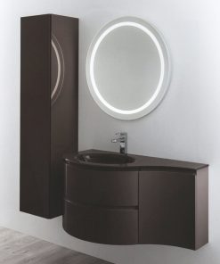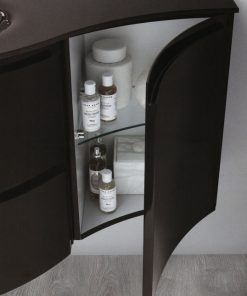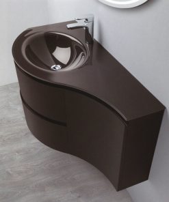 Подвесная база под раковину с двумя выдвижными ящиками и распашной дверцей. Каркас ящиков изготовлен из металла. Боковой отдел оснащён внутренней стеклянной полкой. Возможны другие варианты отделки. Столешница с раковиной заказываются дополнительно