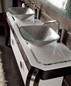 База под 2 раковины, 8 ящиков. Столешница выполнена из стекла, также можно выполнить из дерева или мрамора. Декорирована кожей. Возможны другие варианты отделки.