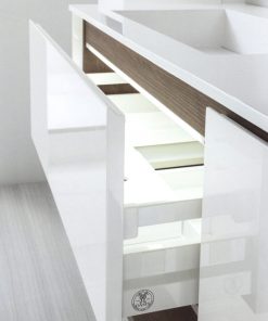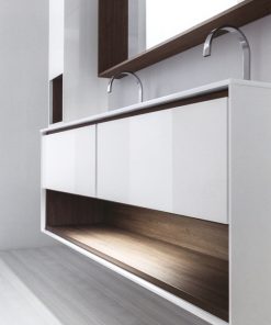 Подвесная база под раковину с двумя выдвижными ящиками и открытой полкой. Каркас ящиков изготовлен из металла. База со столешницей из геакрила с двумя встроенными раковинами. Возможны другие варианты отделки. Дополнительно можно заказать внутреннюю подсветку для ящиков и для полки