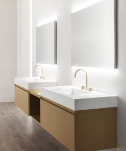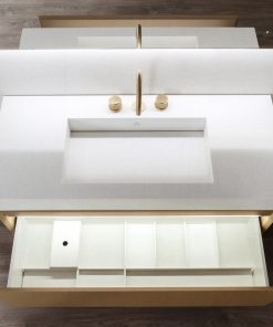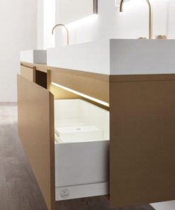 Подвесная база под раковину с двумя выдвижными ящиками и нишей со стеклянной полкой. Предназначена для двух раковин. Каркас ящиков изготовлен из металла. Возможны другие варианты отделки. Раковины заказываются дополнительно. Также дополнительно можно заказать внутреннюю подсветку для ящиков
