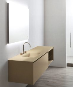 Подвесная база под раковину с выдвижным ящиком и нишей со стеклянной полкой. Каркас ящика изготовлен из металла. База со столешницей из стекла со встроенной раковиной. Возможны другие варианты отделки