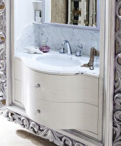 Подвесная база под раковину с двумя выдвижными ящиками, мраморной столешницей и шкафчиком с открытыми полками и зеркалом. Декорирована резьбой. Возможны другие варианты отделки. Дополнительно можно декорировать ручки кристаллами Swarovski