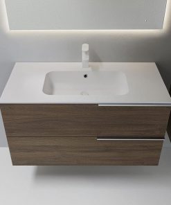 Подвесная база под раковину с двумя выдвижными ящиками. Каркас ящиков изготовлен из металла. Возможны другие варианты отделки. Столешница с раковиной заказывается дополнительно