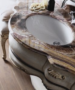 База под раковину с мраморным топом, 2 выдвижными ящиками и полкой. Декорирована резьбой. Возможны другие варианты отделки.