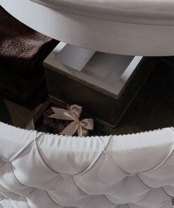 База под раковину с обитым в технике капитоне выдвижным ящиком и керамической столешницей. Возможны другие варианты отделки и обивки.