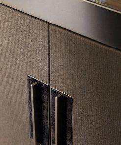 Буфет с четырьмя распашными дверцами и двумя выдвижными ящиками с мраморными ручками. Основание и столешница выполнены из дерева. Профиль основания и фронтальная рама выполнены из металла. Фасад ящиков и створок может быть обит кашемиром или кожей. Возможен вариант фасада в отделке из дерева. Столешница может быть мраморной, зеркальной или из крашенного хрусталя. Возможны другие варианты отделки и обивки. Дополнительно можно заказать подсветку
