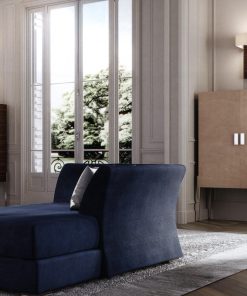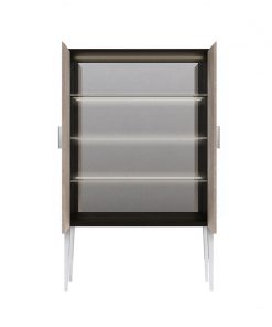 Высокий буфет с двумя распашными дверцами. Оснащён тремя стеклянными полками и подсветкой. Ножки выполнены из металла. Дверцы обтянуты кожей. Возможны другие варианты отделки и обивки