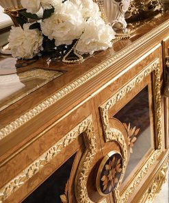 Буфет с четырьмя распашными дверцами и фигурным основанием с изогнутыми ножками. Декорирован инкрустацией и резьбой. Поверхность столешницы оснащена двумя фигурными вставками из стекла. Возможны другие варианты отделки