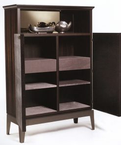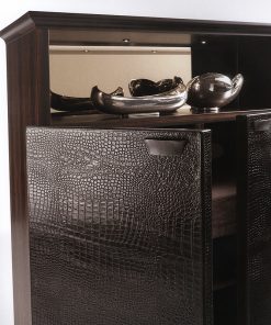 Высокий буфет с двумя распашными дверцами и нишей с зеркальной стенкой и подсветкой. Оборудован двумя выдвижными ящиками и полками в обивке из бархата или кожи. Основание выполнено из металла. Возможен вариант с дверцами в кожаной обивке. Возможны другие варианты отделки и обивки