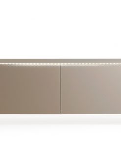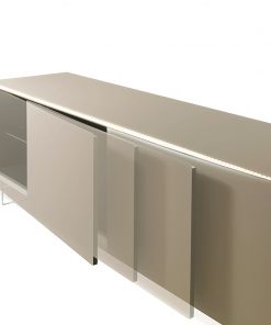 Двухстрорчатый буфет с компланарной системой раздвижных дверей. Выполнен в отделке из крашеного стекла. Декорирован светодиодной подсветкой. Возможны другие варианты отделки