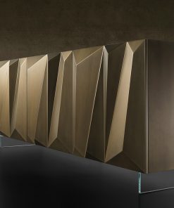 Буфет с тремя распашными дверцами и стеклянным основанием. Оснащён стеклянными полками. Возможны другие варианты отделки