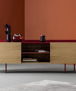 Буфет с двумя распашными дверцами и нишей с открытыми полками. Ножки выполнены из металла. Внутренние полки выполнены из стекла. Возможны другие варианты отделки