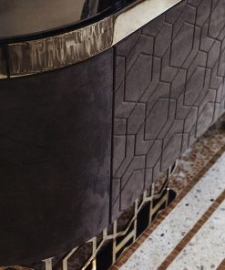 Буфет в кожаной обивке с декором, четырьмя распашными дверцами и овальной зеркальной столешницей. Столешница может быть выполнена из мрамора. Фигурное основание и рама выполнены из металла. Возможен вариант буфета в обивке из кашемира или кожи без декора. Возможны другие варианты отделки и обивки. Дополнительно можно заказать светодиодный светильник со стеклом, устанавливающийся на столешнице из мрамора