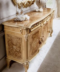 Буфет с 3 распашными дверцами и 2 выдвижными ящиками. Декорирован инкрустацией и резьбой. Возможны другие варианты отделки.