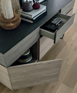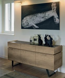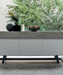 Буфет с металлическими ножками, 3 распашными дверцами и 3 выдвижными ящиками. Столешница покрыта металлом. Возможен вариант с керамической столешницей. Возможны другие варианты отделки.