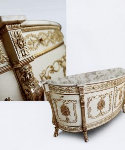 Буфет с 4 распашными дверцами и 3 выдвижными ящиками. Декорирован резьбой и бронзовыми вставками. Столешница выполнена из мрамора. Возможны другие варианты отделки.