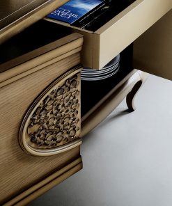Буфет с 2 распашными дверцами и внутренними выдвижными ящиками с системой push pull. Структура — дуб и липа. Декорирован резьбой с цветочной композицией. Возможны другие варианты отделки.
