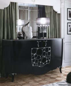 Буфет с двумя распашными дверцами. Декорирован росписью и резьбой. Возможны другие варианты отделки. Дополнительно можно оформить буфет рельефным рисунком или резным декором. Возможно изготовление индивидуальных орнаментальных декоров