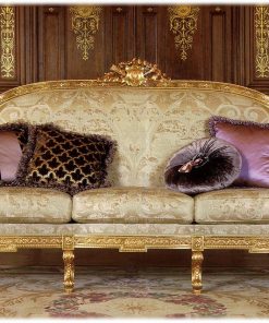 Диван 3-х местный, декорированный резьбой. Обивка — ткань, наполнение — полиуретан. Возможен другой вариант отделки и обивки, в том числе из ткани клиента. В дополнение можно заказать декоративные подушки.