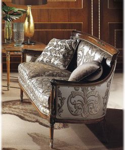 3-х местный диван, жесткие подлокотники. Наполнение — полиуретан. Декорирован резьбой. Ручная работа. Возможны различные варианты отделки (красное дерево, махагон, охра, декапе и т.д.) и обивки.