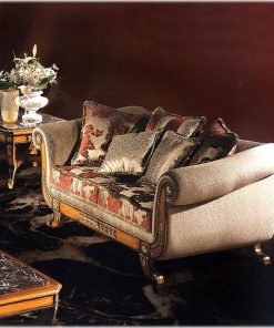 3-х местный диван, спинка расположена на одном уровне с подлокотниками. Наполнение — полиуретан. Декорирован резьбой. Ручная работа. Возможны различные варианты отделки (красное дерево, махагон, охра, декапе и т.д.) и обивки.