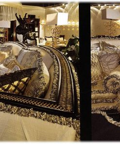 Полукруглый диван, спинка расположена на одном уровне с подлокотниками, декорирован бахромой. Наполнение — полиуретан. Возможны другие варианты отделки и обивки. Пуф в стоимость дивана не входит.