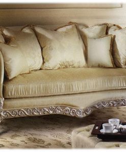 3-х местный диван, спинка расположена на одном уровне с подлокотниками. Наполнение — полиуретан. Декорирован резьбой. Ручная работа. Возможны различные варианты отделки (красное дерево, махагон, охра, декапе и т.д.) и обивки.